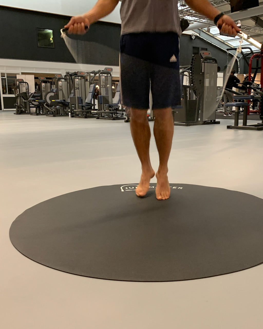 The mat is made of a unique mix of high-quality rubber and PVC, specially designed for skipping rope exercises. The mat is a lot heavier than a regular fitness mat. The weight in combination with the round shape means that the mat remains firmly on the floor during your exercises. The mat absorbs the impact of jumping and gives you a pleasant response and feedback during your daily jump rope workout.